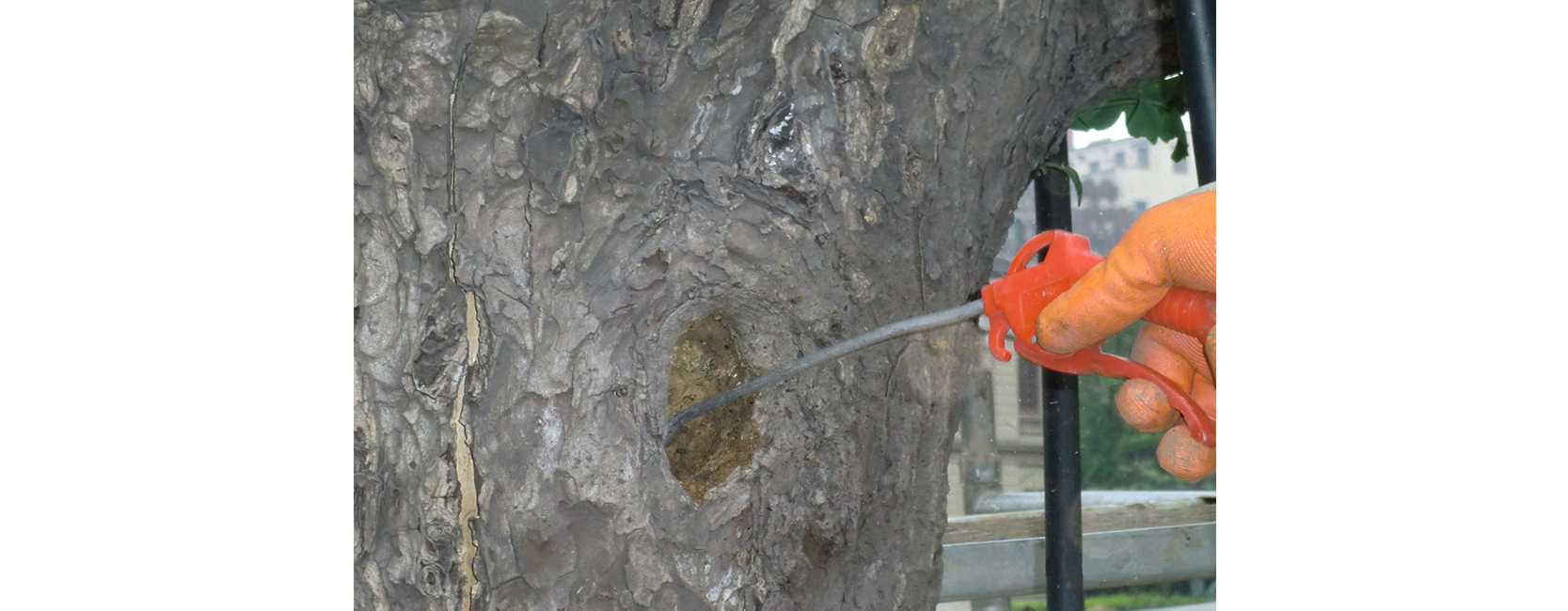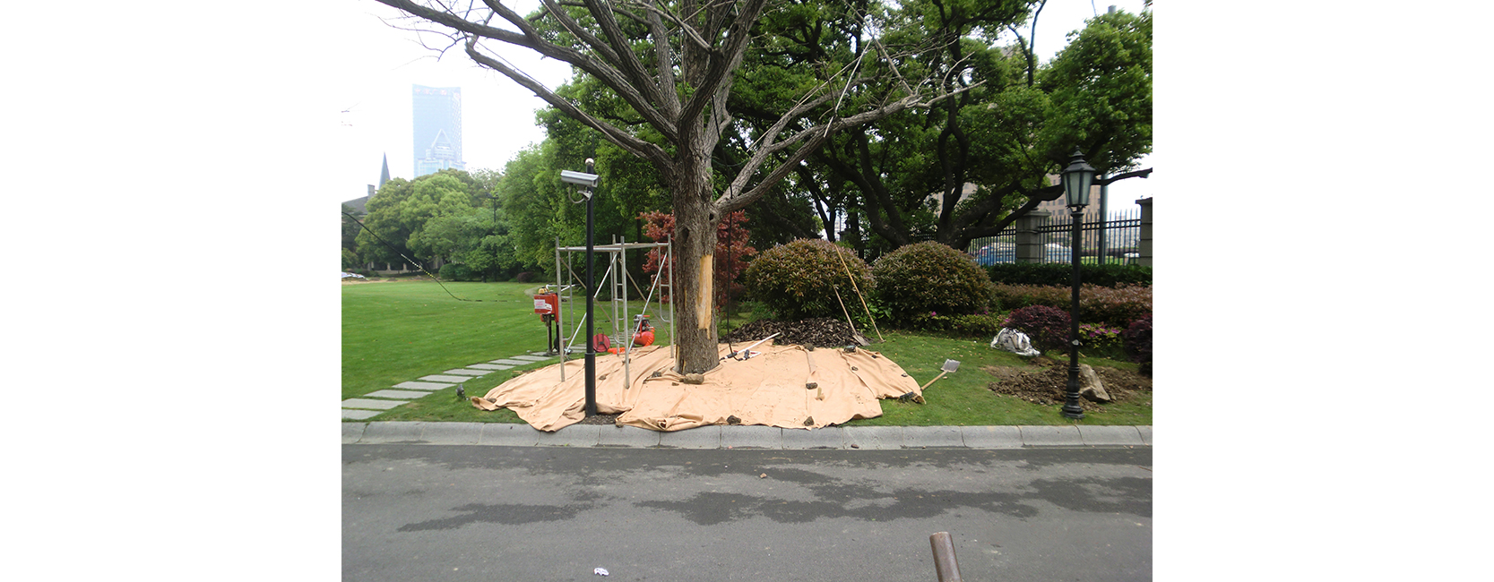 0370#、0371#古银杏,树龄150年以上,位于上海市外滩源,属于上海市古树重点保护资源。由于周边地块建设,对古银杏的生长造成了巨大的影响。两株古树均十分衰弱,并且病虫害侵蚀严重,树体上下多处腐烂空洞,根系有烂根现象。 针对古树存在的问题,采用熏蒸法、清腐法对古树虫害、病害进行“治疗”,空洞部位则进行高强度粘合剂和骨材的填充,以防止树体的断裂。为促使古树能够得到充足的营养补给,通过紧急复壮法等多种措施确保古银杏恢复长势。 古银杏经过近7年来的抢救复壮生长势明显恢复,树叶较以前大且厚,树体腐烂得到有效控制。