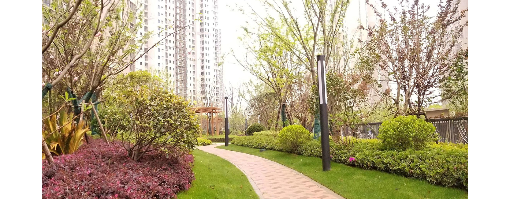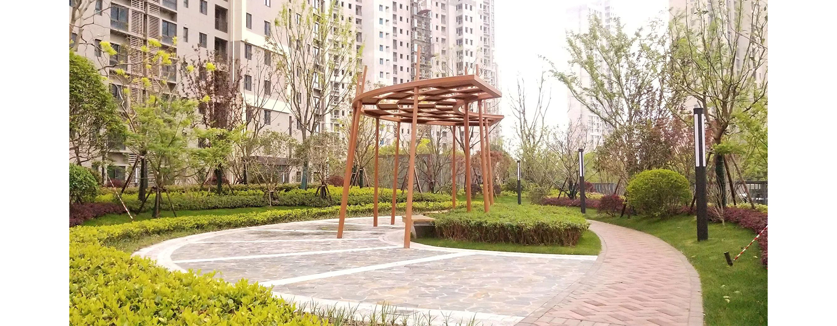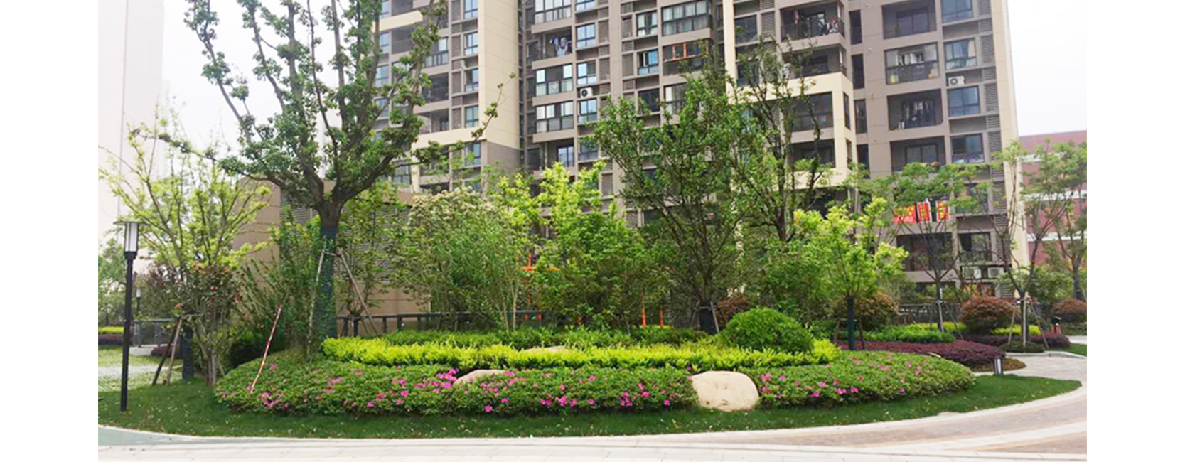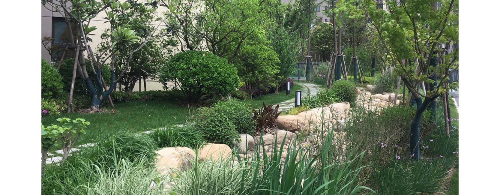 上海风荷丽景·尚城住宅区 荣获:2018年度上海市园林杯优质工程奖 在这个住宅小区花园里,有树有花有草坪,有景有路有雕塑,有桥有溪有跑道,然而有谁知道,这里竟然是一个大型的地下停车库的屋顶,是一个巨型的屋顶花园。 风荷丽景·尚城住宅区整体分为四个景观区域。荷香台区:充分利用植物的季相变化,以花、香、叶、色为四大“关键词”,形成具有特色和个性的植物组团。红河谷区:以红枫、榉树、樱花、桃花、红继木等红叶或红花植物为主,辅以开花的地被,形成“红河谷”独特的景观气质,营造季相分明的植物群落。 远香林区:以桂花、香樟、迷迭香等有香味的景观植物为主,结合常绿、落叶乔灌木,与南面的远香湖相呼应,是一个风景宜人的宅后花园。商业区:以栾树四季多变的观赏特性作为主景乔木,辅以红枫、黄金槐、鸡爪槭等作为中层成形组团,利用植物丰富鲜艳的叶色变化,既能和周边的市政绿化形成对比和过渡,又能给人一种整体感及和谐感。 旱溪、花境、植物配置、建筑小品以及园路是该住宅小区的景观亮点。通过60吨的太湖景石和鹅卵石营造的三条长度20米至60米旱溪,蜿蜒在小区的园路旁,布置钢结构的景观旱桥,种植小兔子狼尾草、金边阔叶麦冬、柳叶马鞭草、千屈菜、紫穗狼尾草、百子莲、花叶芒、蒲苇等植物,营造出刚柔相济的景观氛围。植物配置方面,桂花、红梅、蜡梅、茶梅、茶花、毛鹃等开花植物以及杨梅、枇杷等花果树木,在整个空间“随时”可见,几乎每个季节都有花与果呈现,季节的物语生动而多彩。高低错落、色彩绚丽的植物群落,形成季节的表情。建筑小品运用大自然的语言,结合“荷”的元素设计半展式莲子镂空造型廊架,光影在植物上呈现出一种特别的意境。园路的铺设以荷叶的经络为灵感,在建筑群中引路导航,使绿被与建筑的高差形成一种艺术视线,成为社区精致生活的标签。 项目建设初期,从自然土壤到轻介质材料,从铺设简单的排水层到蓄排水技术,包括防止渗水、阻根、确保植物能承受风力,以及如何种植、养护都是不小的挑战。针对以上问题,我司从滤水层着手,通过排水板、隔水层土工布等手段,设计了平均厚度为1.5米的种植层进行绿化布置,绿化土壤厚度大于60公分,施工中采用了防水技术,并通过堆土造坡营造了一个此起彼伏、高低错落的花园地形。为解决大型乔木在屋顶的种植问题,大树大苗的种植被安排在地下室承重墙或承重柱的上端,成功种植了40余种乡土植物品种,如丛生朴树、榉树、乌桕等形态好、生态效果佳的骨架树种。 这座建立在屋顶上的大花园,不但降温隔热效果优良,而且能美化环境、净化空气、改善局部小气候,还能丰富城市的空中景观,是使用功能、生态效益、园林美学、社会效益的综合体现。 |